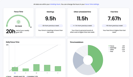 See detailed insights on how you spend your time. Scheduled vs. actual, meeting load, and productivity trends.
