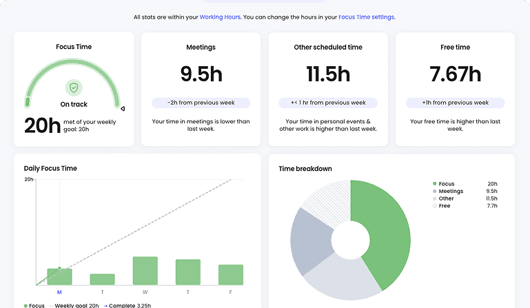 Smart scheduling links, 1:1 optimisation, and meeting-free days help reduce calendar chaos and protect your focus time.