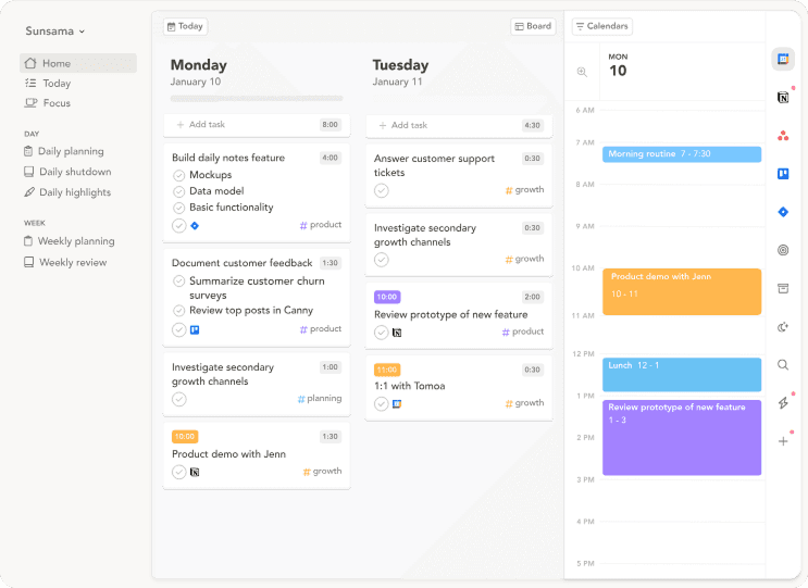 Sunsama's morning planning and evening shutdown routines help you start and end each workday with intention. Great for preventing burnout.