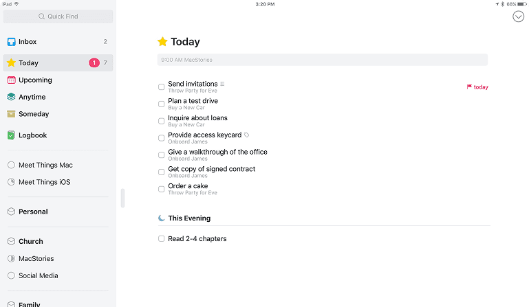 Areas, Projects, and Tags let you organise tasks with precision. The "This Evening" and "Someday" features help you plan both daily work and long-term ideas.
