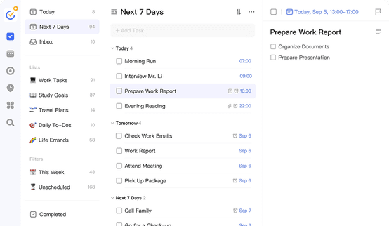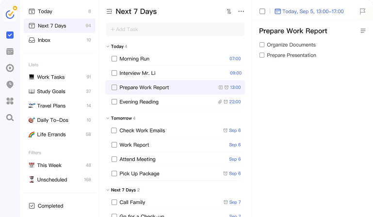 See your tasks in day, week, or month views. TickTick's calendar integration is more robust for those who think in schedules.