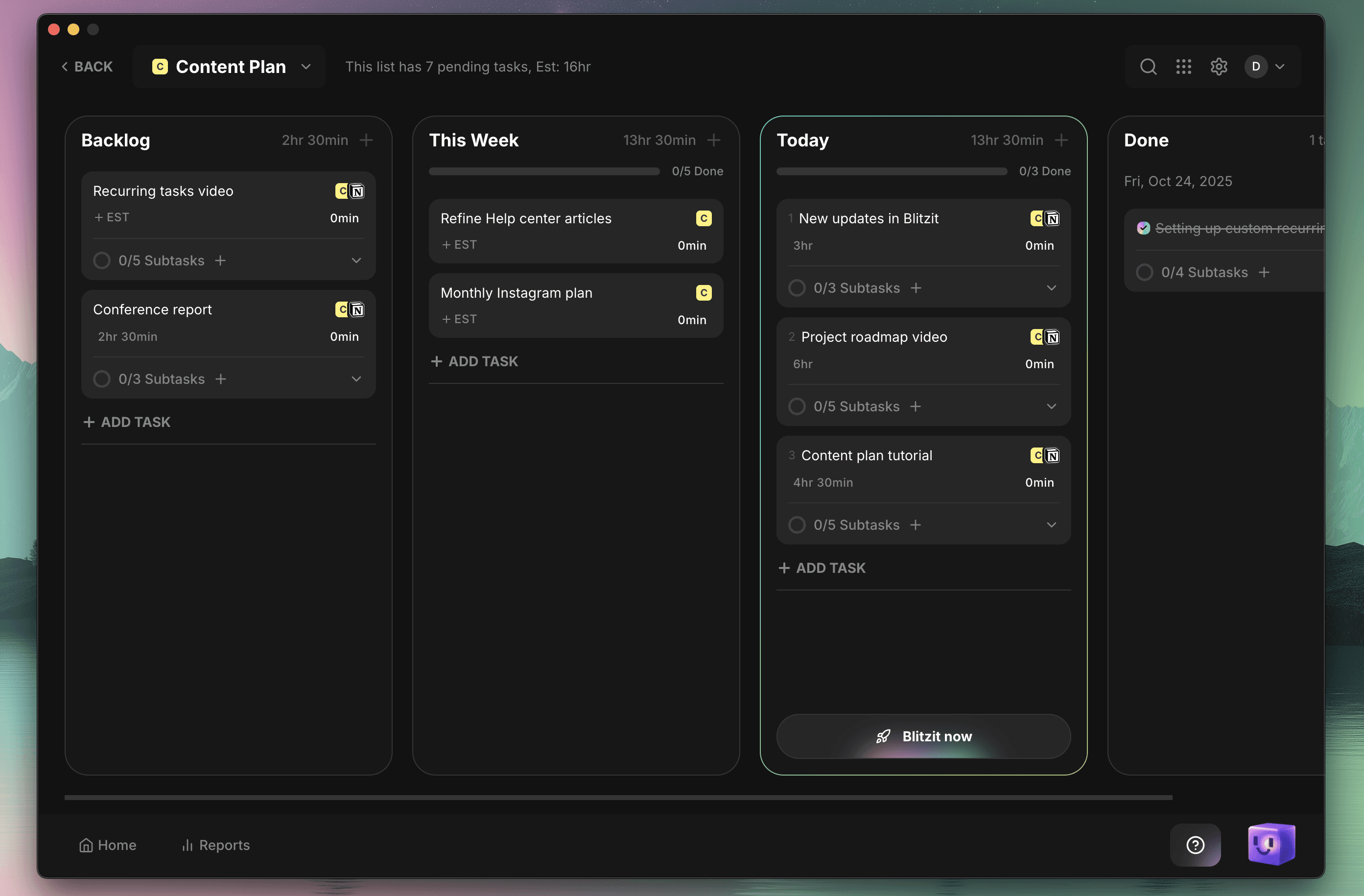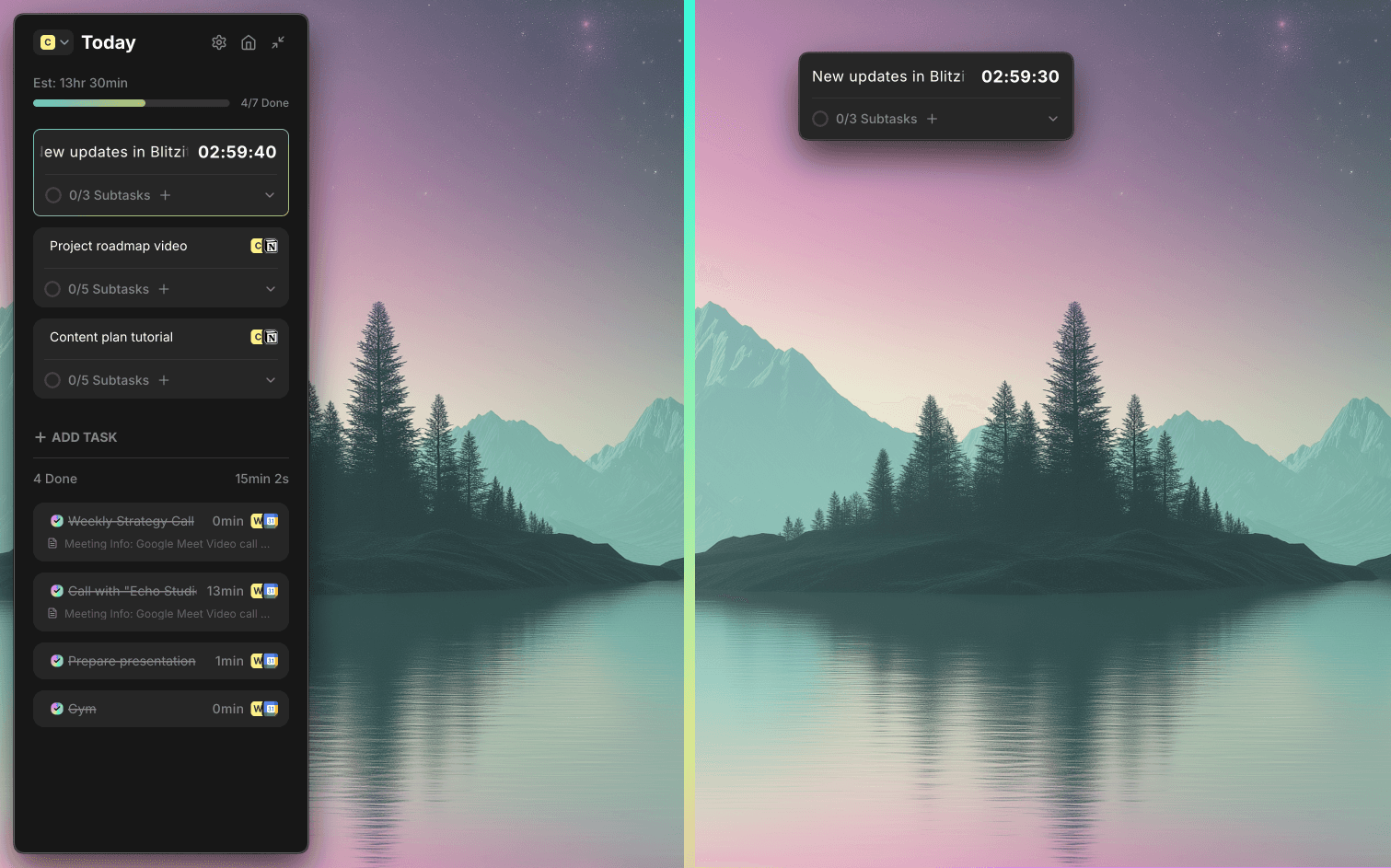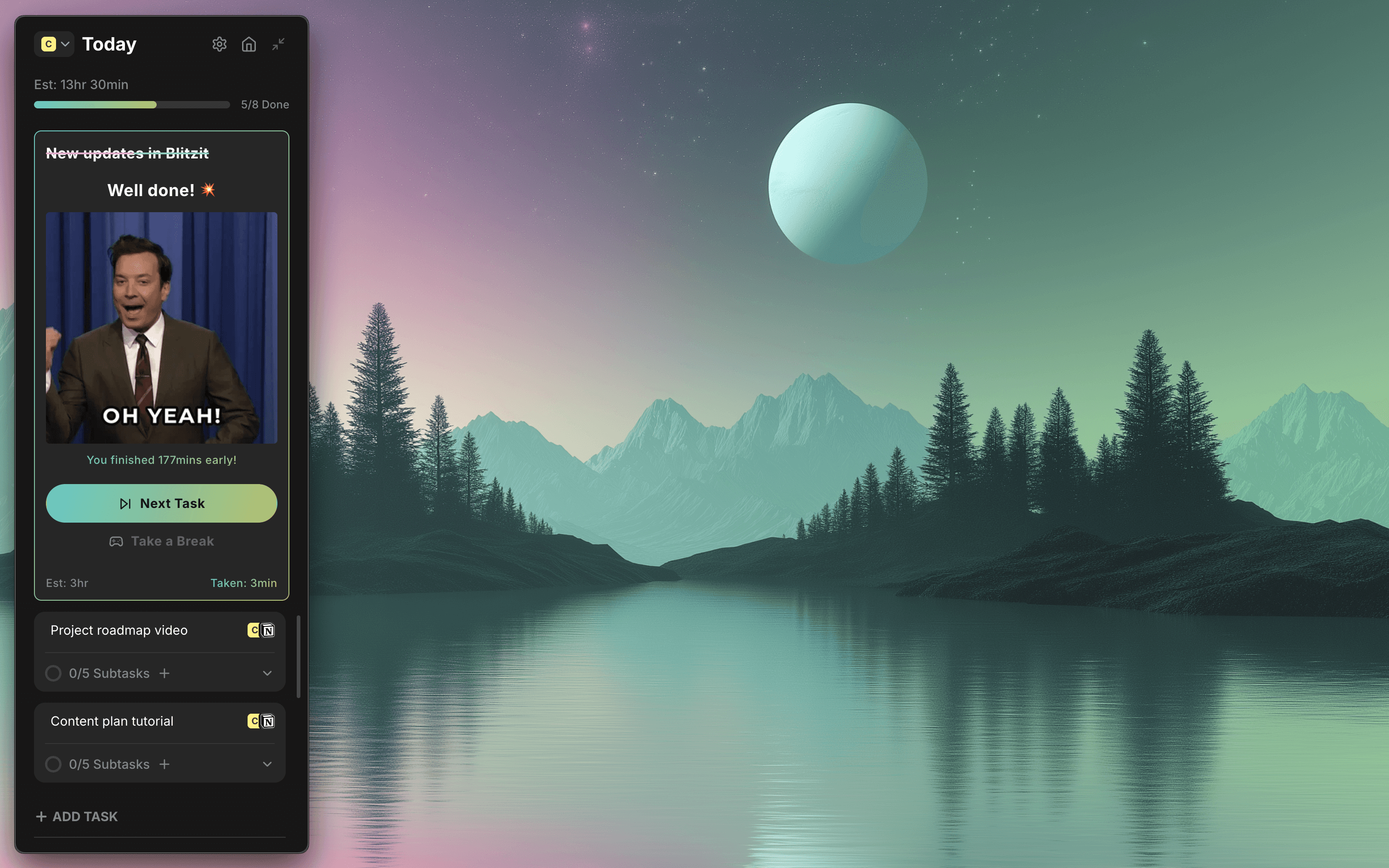 Blitzit is a personal productivity tool built around a simple to-do list that can collapse into a floating countdown timer, keeping your current task always visible so you stay focused. It includes additional features such as Pomodoro timers, productivity reports, task scheduling, notes, and more — all designed to help you focus, prioritize, and regain control of your time.