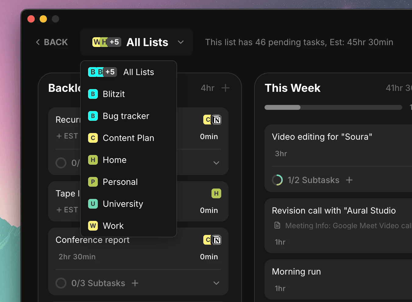 All Lists View — seeing all your tasks across lists combined into the same Backlog / This Week / Today structure