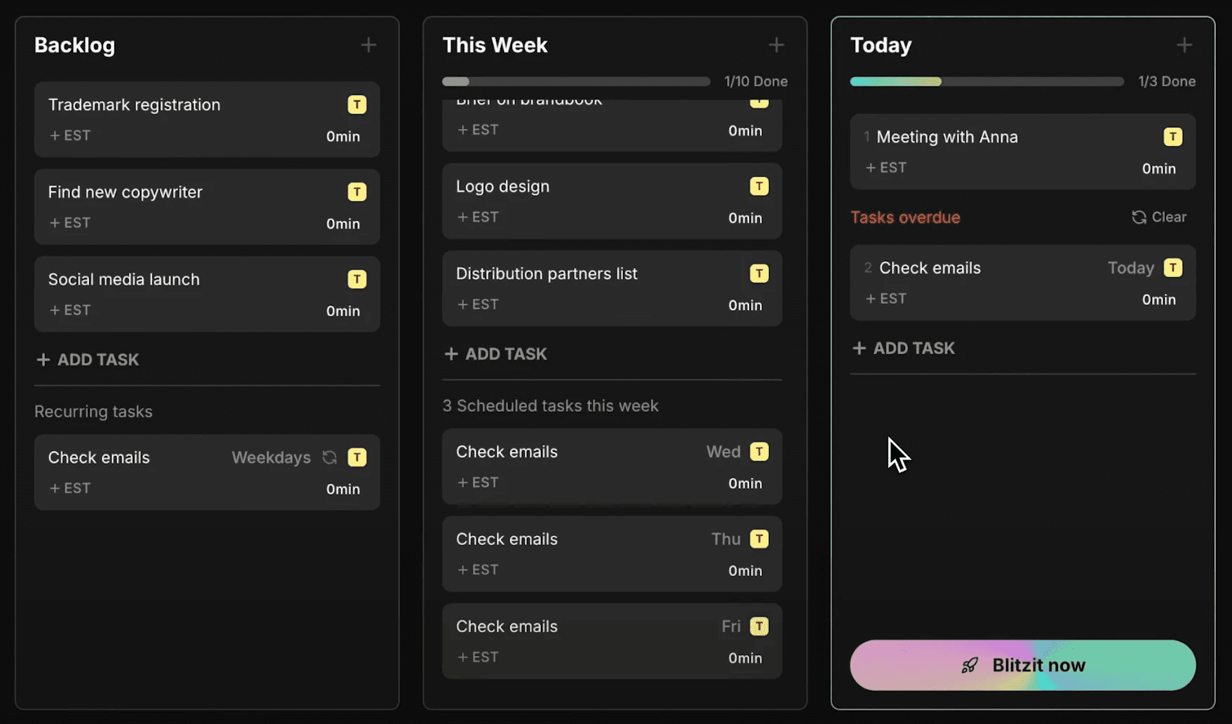 This prevents Blitzit from overwriting any modifications you made to older child tasks (renaming, adding notes, changing EST, etc.) and gives you the choice between continuing with the existing tasks or starting fresh.