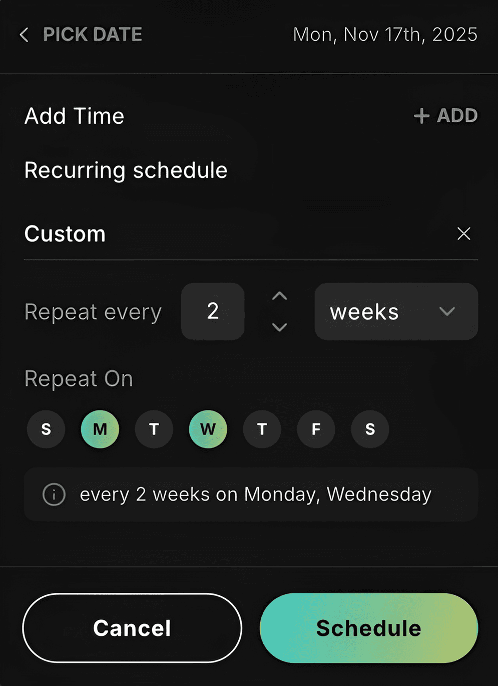 Monthly (e.g. “Every month on 7th”) — Repeats on the same calendar date you selected (e.g. the 7th of each month)