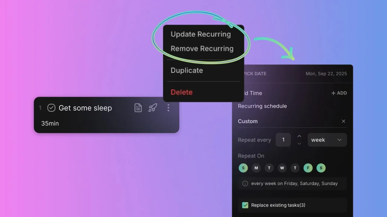 If your task repeated daily but you change it to only Fri–Sun, choosing Replace removes the old daily tasks and keeps only the new ones.