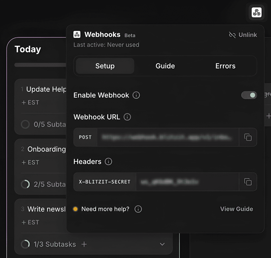 Note: Each Blitzit list has its own unique Webhook URL and Header.