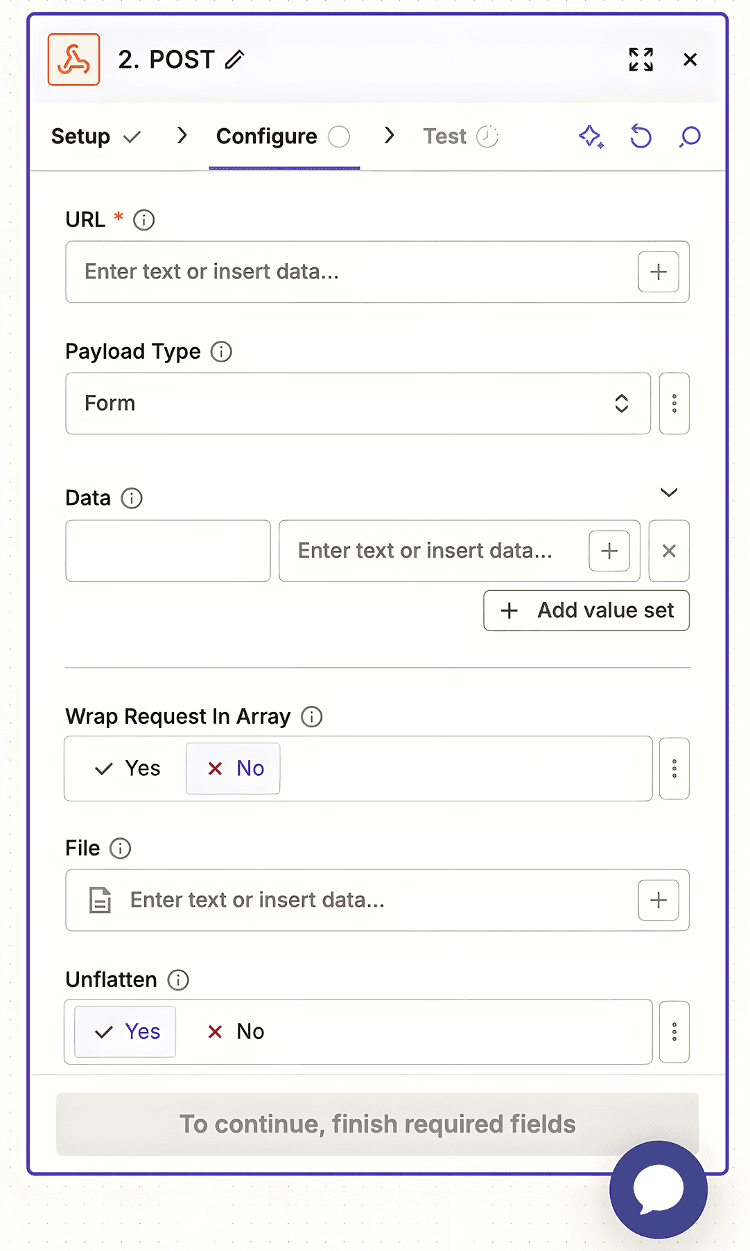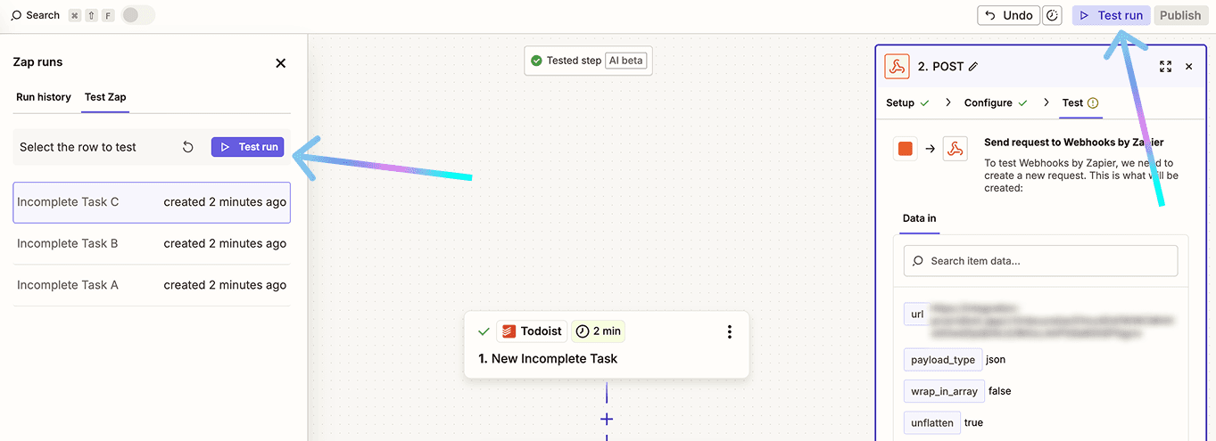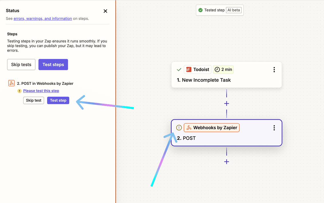 If Zapier shows an exclamation mark next to a step, click it and select Test step to run another test.