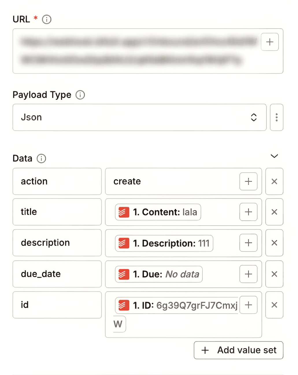 action→createtitle→ Type/and select Contentdescription→ Type/and select Descriptiondue_date→ Type/and select Dueid→ Type/and select ID