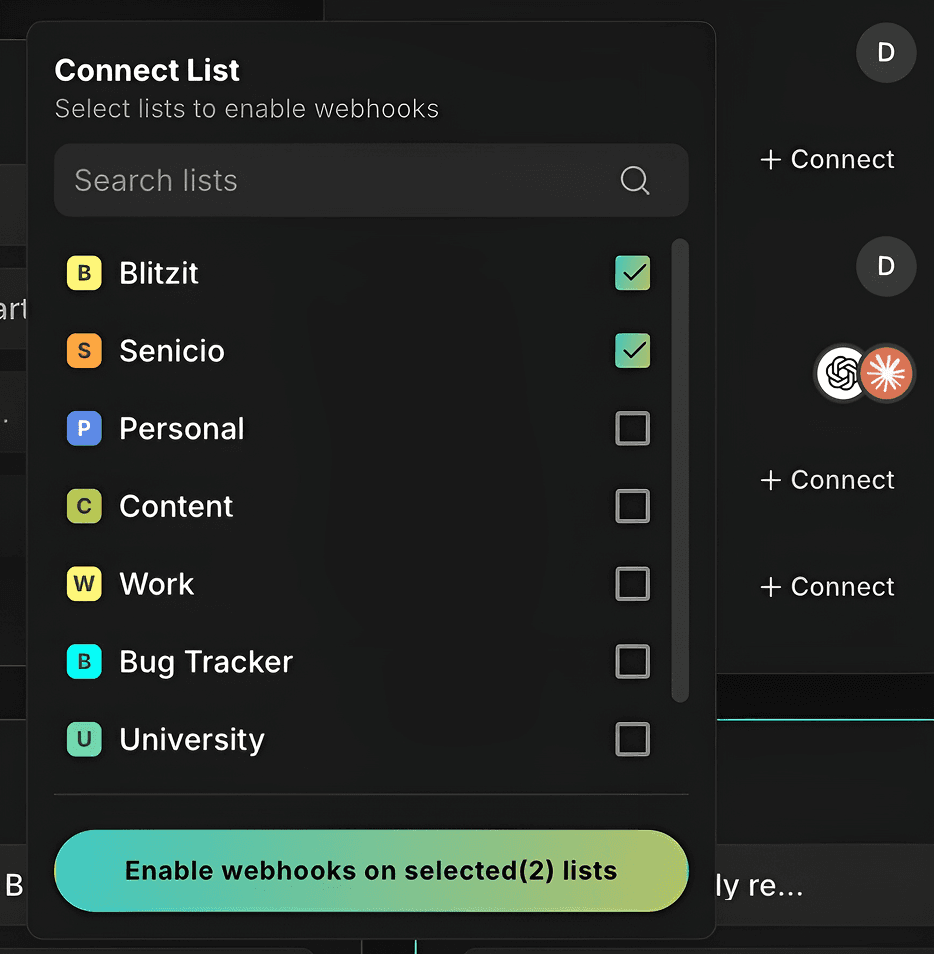 In any connected list, clicking the Webhooks icon (top right) opens settings with: