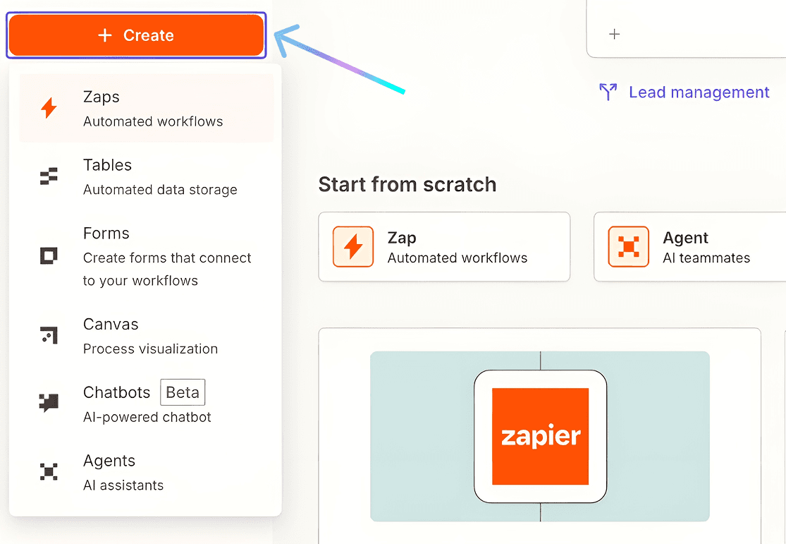 Go to Zapier, press + Create on the top left and click Zaps to start creating.