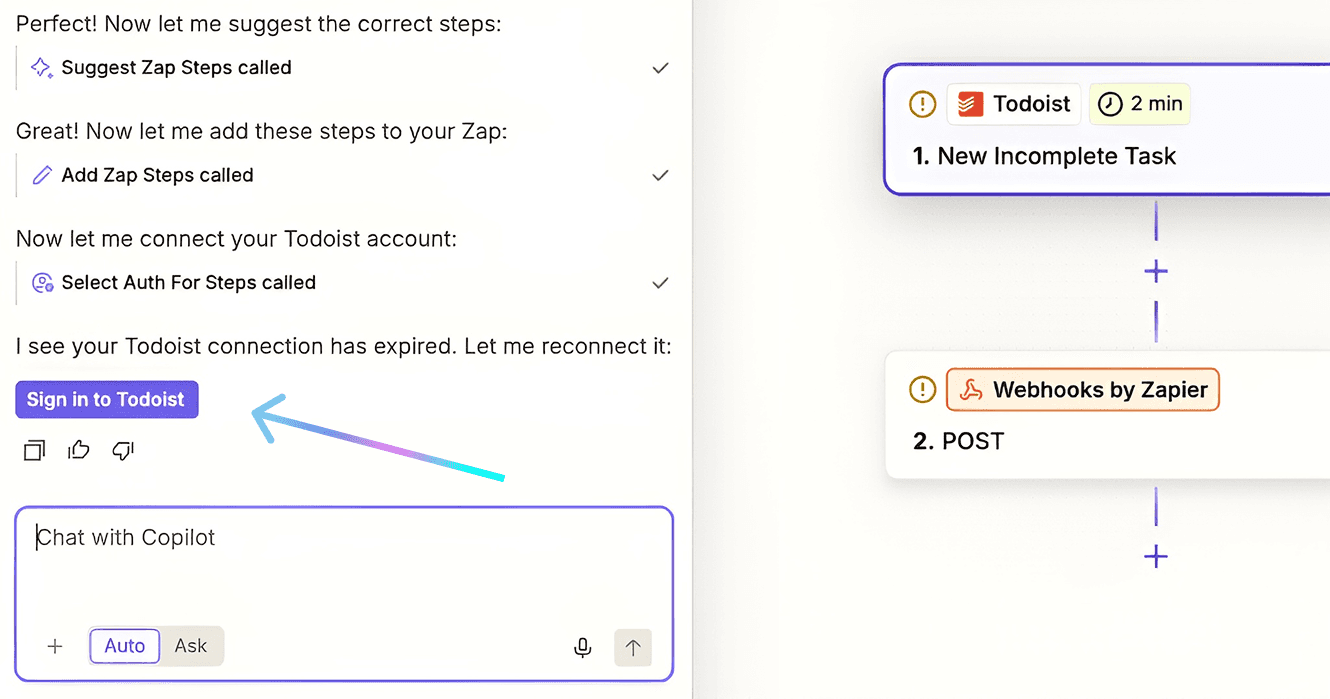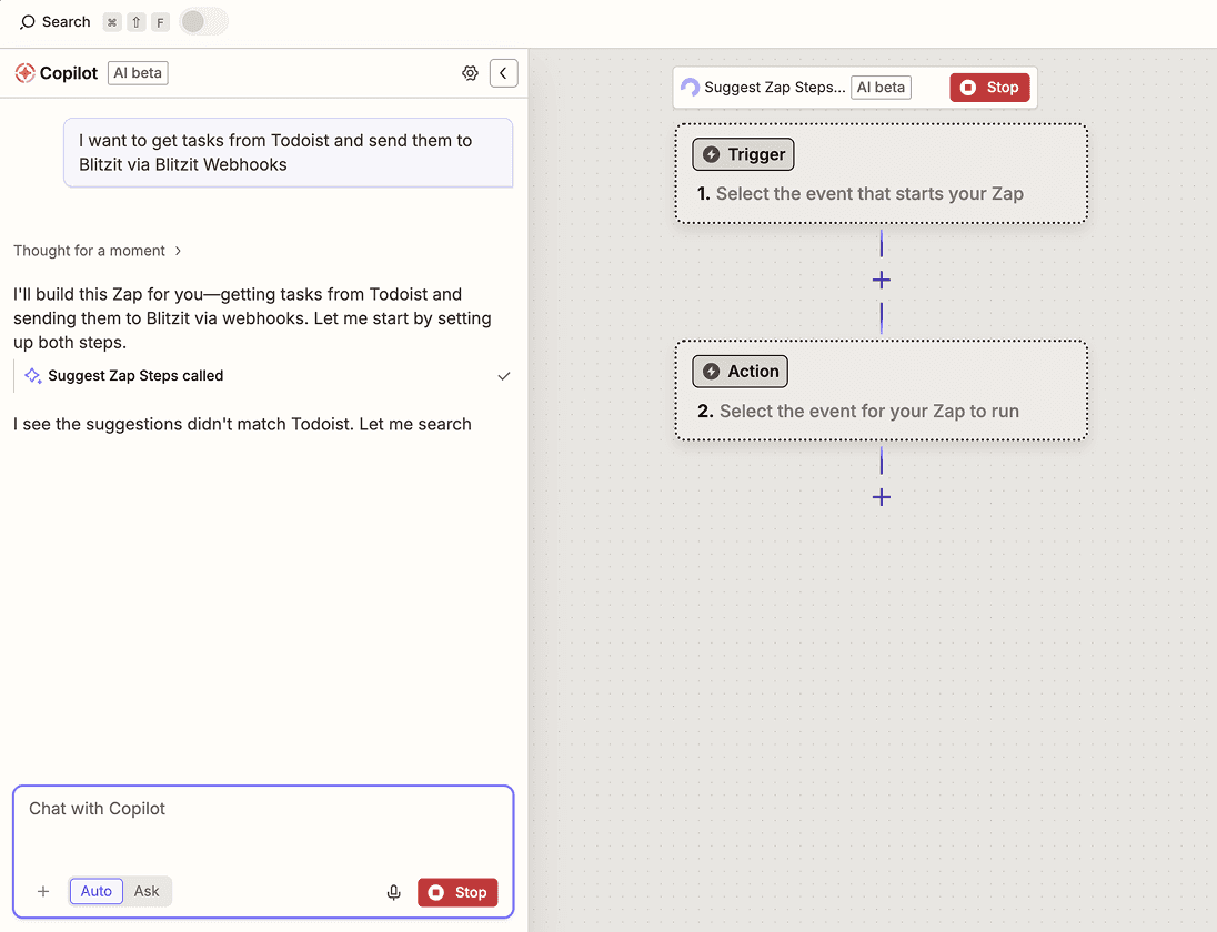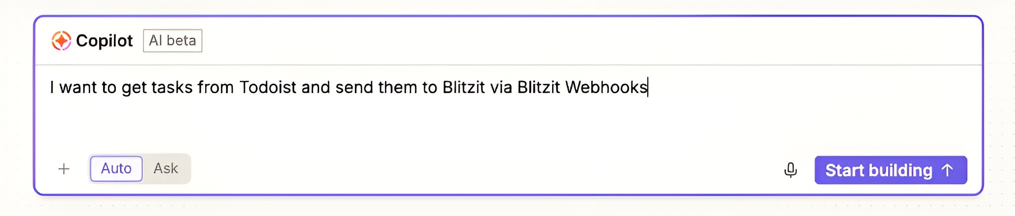 Describe your connection to Copilot AI: "I want to get tasks from Todoist and send them to Blitzit via Blitzit Webhooks".