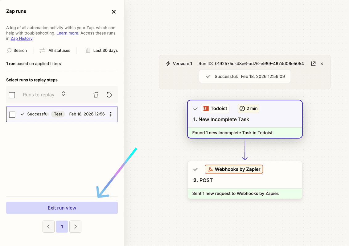 Check if the test task appears in Blitzit, then click Exit run view (bottom left).